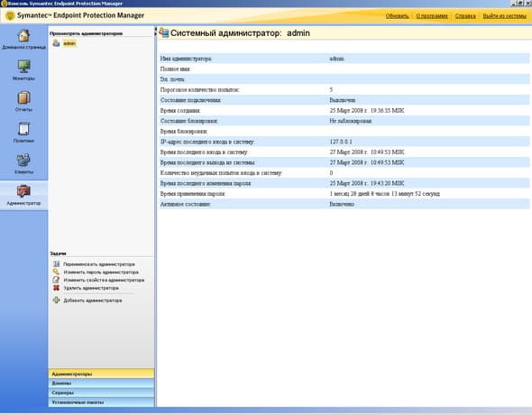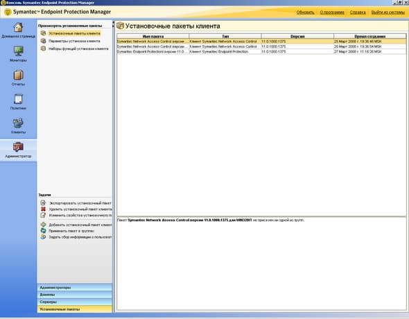 Рисунок 2.24: Endpoint Protection Manager Console – Clients – Install Packages – Add Client Install Package – Данный раздел позволяет создавать для каждой группы набор пакетов инсталляции или пакетов обновлений с включением требуемых функций и определенных версий, в том числе возможна поддержка пакетов разной языковой локализации на одном сервереРисунок 2.25: Endpoint Protection Manager Console – Admin – Administrator – Сводная панель основных администраторских настроек системы: доступ, домены, основные и второстепенные сервера управления, клиентские пакеты
