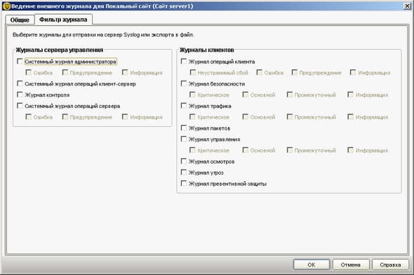 Рисунок 2.28e: Endpoint Protection Manager Console – Admin – Servers – External Logging – Администратору также представлена возможность настройки репликаций системных логов и логов безопасности в режиме реального времени в другие системы
