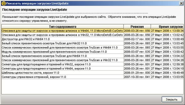 Рисунок 2.29: Endpoint Protection Manager Console – Admin – Servers – Show LiveUpdate Downloads – Просмотр информации по текущим версиям обновляемых компонент, включая обновления клиентских модулей