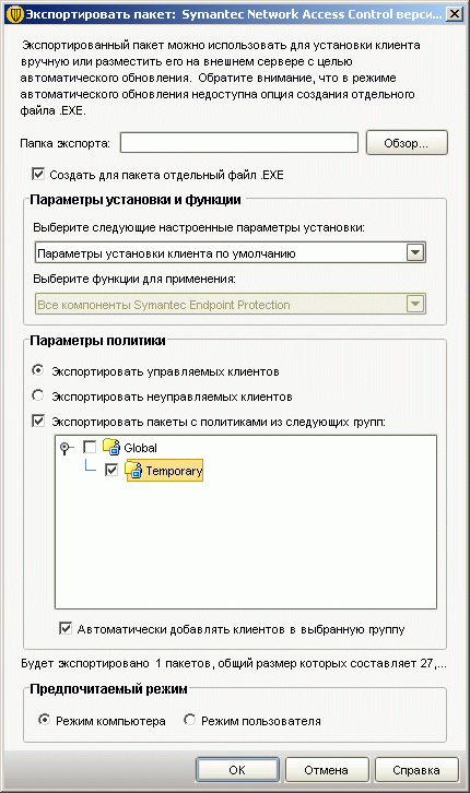 Рисунок 2.32c: Endpoint Protection Manager Console – Admin – Install Packages – Client Install Packages – Add Client Install Package – Создание нового варианта стандартного пакета установки с возможным выбором набора функций, создания exe или msi пакета и указанием группы импортируемых политик безопасности