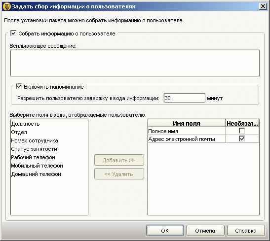 Рисунок 2.32d: Endpoint Protection Manager Console – Admin – Install Packages – Set User Information Collection – Данный механизм позволяет активировать на клиентской стороне запрос персональных данных от пользователя в соответствии с выбором, сделанным Администратором