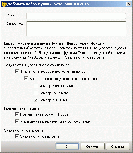 Рисунок 2.32f: Endpoint Protection Manager Console – Admin –Install Packages – Client Install Feature Sets – Add Client Install Feature Set – Создание нового предустановленного набора компонент, использующегося для создания пакетов установки (см. Рисунок 2.24, 2.32c)