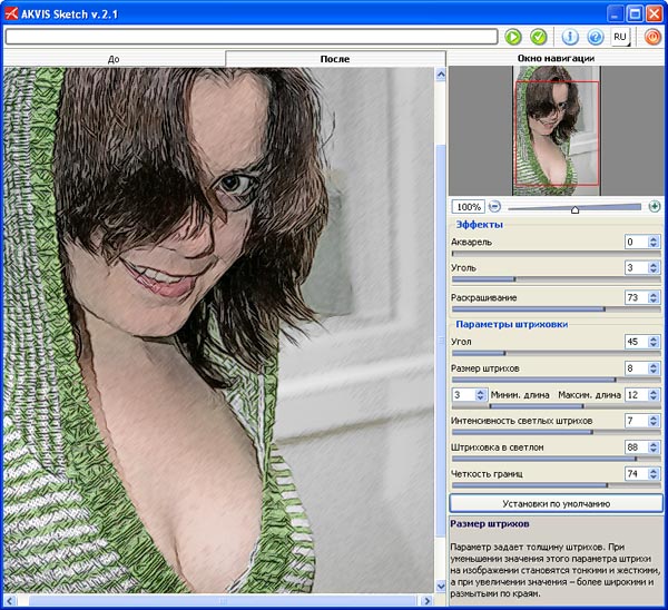 Стилизация может происходить как в светлых, так и в темных тонах. Допускается регулировка баланса штриховки, а также отдельное управление процедурой внутри светлых участков фото. И, наконец, вы можете указывать четкость границ, то есть виртуальную аккуратность художника.