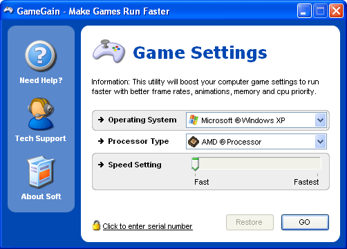 Отчего возрастает скорость в играх? Программа вносит изменения в реестр, увеличивая объем свободной памяти, меняя приоритеты запуска приложений, корректируя правила прорисовки экрана и его частоты обновления. Разработчики клянутся, что после установки их утилиты частота смены кадров в DOOM 3 может увеличиться вдвое. Мало того, если в системе присутствуют какие-то проблемы, которые могут привести к потере производительности в играх, то GameGain их обнаруживает и устраняет.