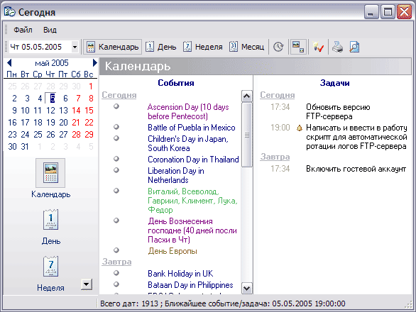 Отдельного упоминания заслуживает модуль WinOrganizer, который называется Сегодня. Открыть окно этого модуля можно при помощи одноименной кнопки в левом нижнем углу главного окна органайзера.