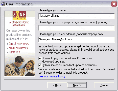 После запуска файла установки ZoneAlarm необходимо ввести своё имя и почтовый адрес, на который могут приходить уведомления об обновлениях продукта и новости. ZoneAlarm необходимо зарегистрировать на сайте ZoneLabs.