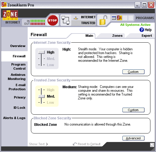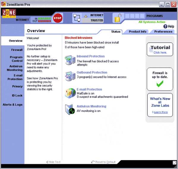 Главное окно ZoneAlarm продемонстрировано ниже.