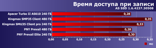 Прошивка мешает Apacer Turbo II AS610 и здесь, однако даже такая фора не помогает накопителю Kingmax с асинхронной памятью. А вот его собрат с синхронной, напротив, порадовал — угнался даже за вдвое более емким PNY и, соответственно, обогнал все остальные протестированные нами «SF-based» на 240 ГБ. Единственное, что омрачает радость — твердотельные накопители на других контроллерах работают при таком сценарии доступа еще быстрее.