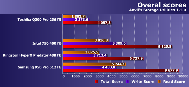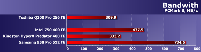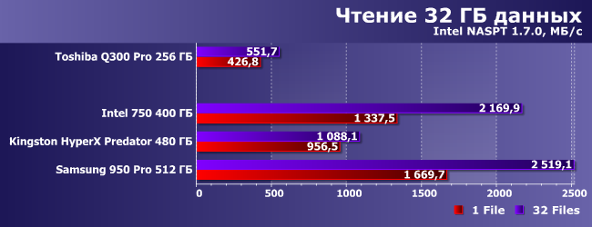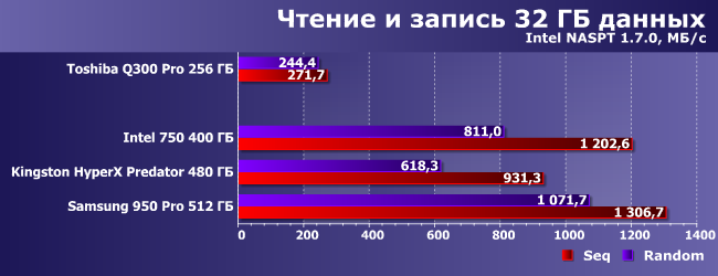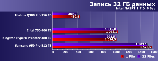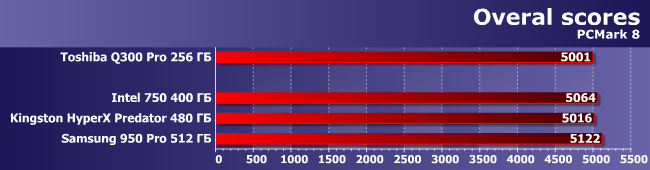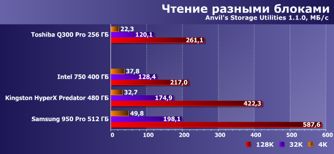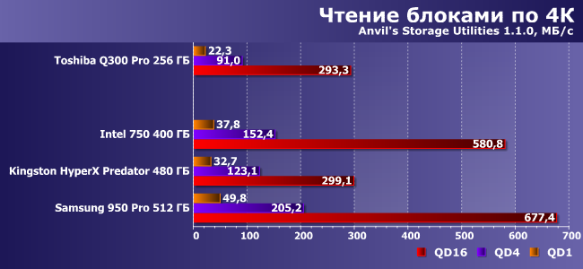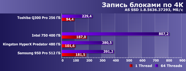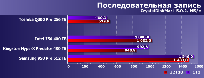 | Intel 750 400 ГБ | Kingston HyperX Predator 480 ГБ | Samsung 950 Pro 512 ГБ | Toshiba Q300 Pro 256 ГБ |