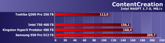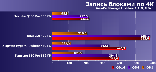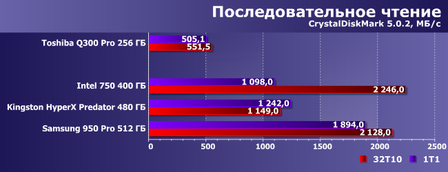 | Toshiba Q300 Pro 256 ГБ | Intel 750 400 ГБ | Kingston HyperX Predator 480 ГБ | Samsung 950 Pro 512 ГБ | |