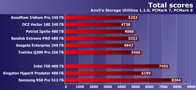 В первую очередь «играет» здесь пропускная способность интерфейса; сложной работы не наблюдается, так что результаты закономерные. Во-первых, PCIe лучше SATA, а PCIe 3.0 лучше, чем 2.0 (при одинаковом количестве линий, разумеется). Во-вторых, как рыба в воде себя чувствует Samsung 950 Pro. Intel 750 тоже мог бы... но кто ж ему даст :)