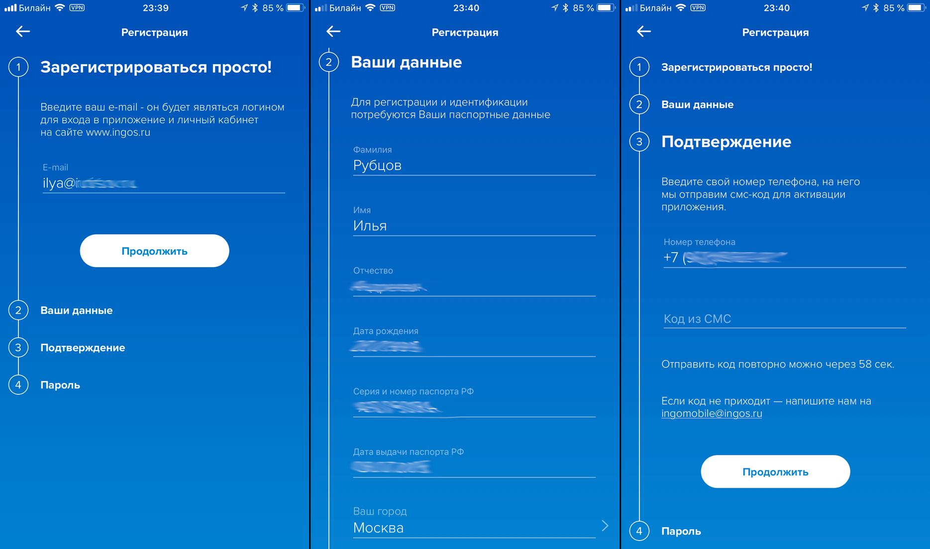 Регистрация простая. Потребуется указать ФИО, номер паспорта, дату рождения, адрес электронной почты и номер телефона (на него придёт проверочный код). После этого задаётся PIN-код для входа в приложение, но вводить его каждый раз не обязательно, если у смартфона есть сканер отпечатков пальцев.