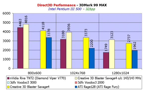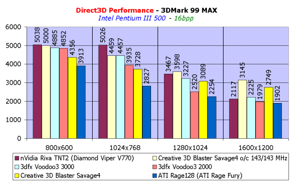 В первую очередь посмотрим на результаты, полученные в 3DMark 99 MAX на процессоре Intel Pentium III — 500 MHz.