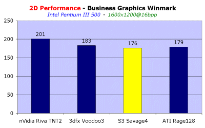 Итак, что же мы видим в нашем случае? А только одно — скорость в 2D у Creative 3D Blaster Savage4 невелика. Конечно, не настолько, она почти соответствует показателям ATI Rage128, но факт последнего места S3 Savage4 среди всех новейших видеочипсетов мы должны отметить.