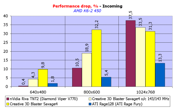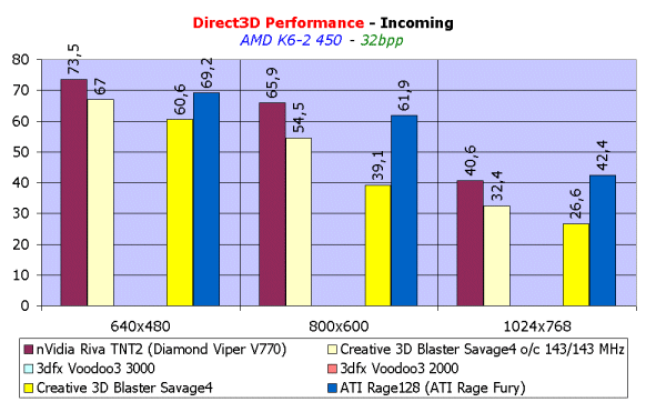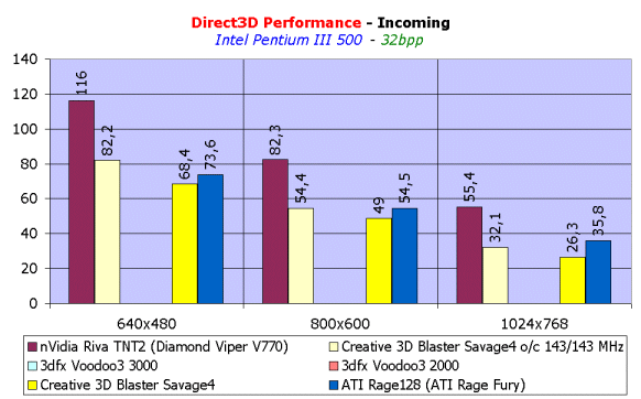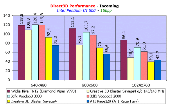Популярнейший инструмент для измерения производительности видеокарт в Direct3D — игру Incoming мы, конечно же, тоже не забыли. Тем более, что это практически единственный продукт, который может дать более-менее объективную оценку падения производительности при переходе с 16- на 32-битный цвет. К сожалению, Incoming поддерживает только 3 разрешения. Ниже приводится результаты в 16- и 32-битном цвете: