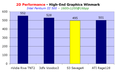 Итак, переходим к тестам. Первое, с чего мы начнем — это 2D графика. Ниже представлены результаты тестирования скорости 2D в разрешении 1600х1200 с 16-битной глубиной цвета в системе с процессором Intel Pentium III 500: