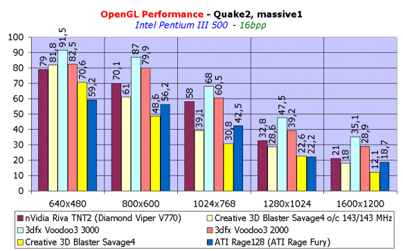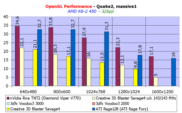 Ну здесь картина та же — оставание по всем статьям, хотя и в меньшей степени. Даже в некоторых разрешениях Creative 3D Blaster Savage4 работает на уровне Rage128.