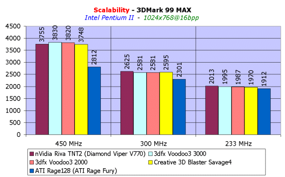 А вот посмотрев на диаграмму масштабируемости, то есть на зависимость производительности видеокарты от частоты работы процессора можно сказать, что по скорости в K6-2 системах Creative 3D Blaster Savage4 стоит на 2-м месте после Voodoo3: