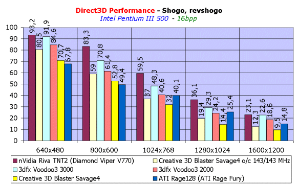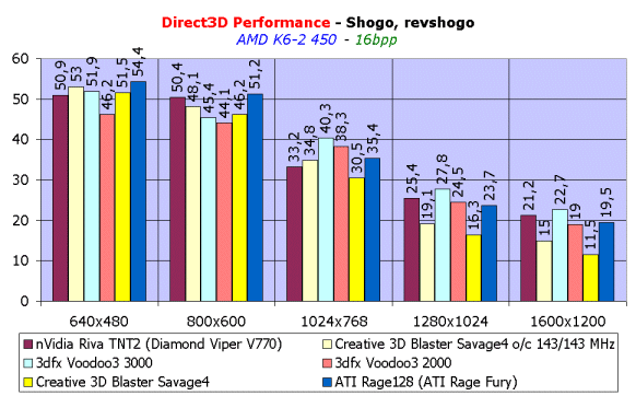Далее, мы решили ввести в наш инструментарий для тестирования известную игру Shogo от Monolith Games. Эта игра обладает средствами измерения fps, а также может использовать мультитекстурирование. К сожалению, это приложение пока поддерживает только 16-битный цвет, поэтому только одна диаграмма результатов: