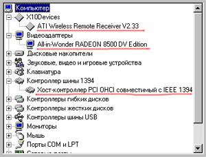 Позднее в переписке с ATI изготовители подтвердили мои предположения о "черном списке". Действительно, практически на всех материнских платах от Intel эта видеокарта со своим экзотическим AGP мостом на чипе ATI BRIDGE 218B41ASA12 вызывала конфликт устройств, что проявлялось в неработоспособности всех устройств в PCI слотах расширения. В качестве решения было предложено отключить на видеокарте контроллер шины IEEE-1394. Отключается чип этого контроллера миниатюрным DIP переключателем на плате. Эта рекомендация помогла, но, соответственно, встроенный в плату DV контроллер стал недоступен. Выбирая их двух зол меньшее, пришлось пожертвовать этим контроллером.