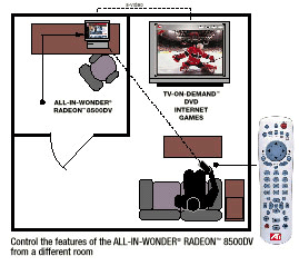 Вопреки сложившейся традиции, данный пульт использует не инфракрасный канал, а радиочастотный. Тем самым устранен основной недостаток пультов на ИК канале — необходимость направлять ИК-светодиод передатчика на приемник и невозможность управлять через непрозрачные преграды между передатчиком и приемником. Практические испытания дальности показали, что приемник уверенно ловит сигналы передатчика на расстоянии более 40 метров через три толстые железобетонные стены. Именно на таком преимуществе акцентирует внимание производитель, демонстрируя удобство управления компьютером, находящимся в другом помещении (см. рис. ниже).