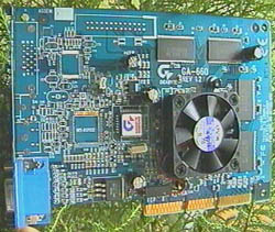 Видеокарта имеет AGP 4x конструктив и TV-out. Как теперь принято, ТВ-выход представляет собой гнездо S-Video, а в поставку входит переходник S-Video-Composite. Плата снабжена 32 Мбайтами 5.5 ns памяти, расположенной по обеим сторонам карты (таким образом, плата в целом мало отличается дизайном от предыдущей). На чипсете установлен активный кулер. Причем, не приклеен, а смонтирован на крепеже (мы уже много раз утверждали, что этот способ монтажа охладительной системы намного эффективнее приклеивания кулера к чипсету). Да и сам вентилятор, как можно убедиться, глядя на фотографию, намного более эффективен, чем все рассматриваемые выше.