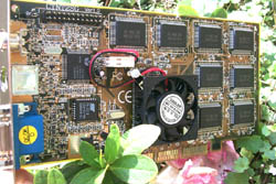 По умолчанию карта тактуется на 125/150 МГц как обычные nVidia Riva TNT2-карты. Максимальные значения частот устойчивой работы платы достигли 150/220 МГц. Естественно, что для получения таких частот потребовалось прикрепить на радиатор вентилятор.