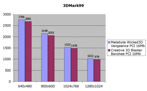 Тестирование проводилось в сравнении с Creative 3D Blaster Banshee, которая внешне очень похожа на Vengeance. Испытания проводились на том же компьютере, что и карты на Voodoo². Результаты представлены ниже: