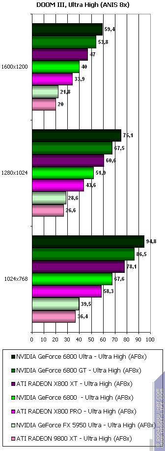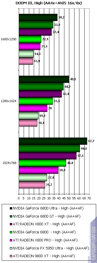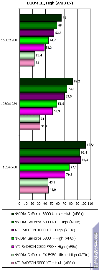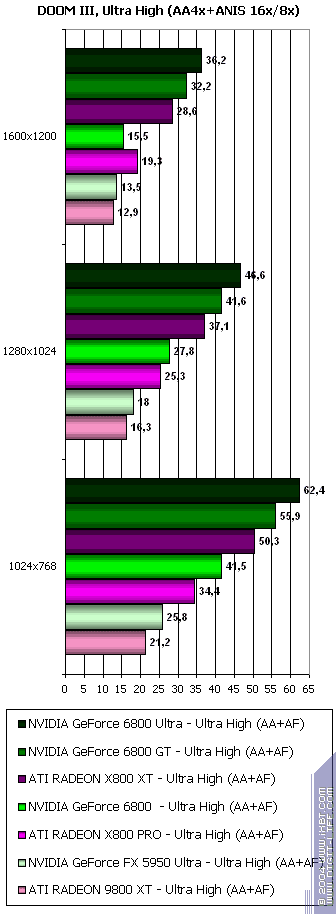 Такие плачевные результаты у ATI и блестящие у NVIDIA легко объяснимы. Мы все помним еще со времен выхода DOOM III Alpha (вернее, его утечки), что изюминкой игры является активное использование теней, которые реализованы через буфер шаблонов (Stencil). А еще со времен GeForce FX нас NVIDIA уверяла, что при работе с Z и стенсилом скорость ускоряется в 2 раза, относительно работы с пикселами. И при наличии 16-ти конвейеров у 6800 Ultra за такт обрабатывается по 32 результата по Z и стенсилу. Чего нет у продуктов ATI.