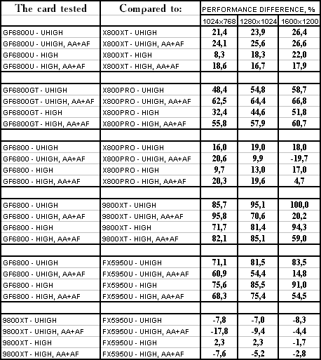 - NVIDIA GeForce 6800 Ultra против ATI RADEON X800 XT — также победа за продуктом NVIDIA, перевес до 27%.