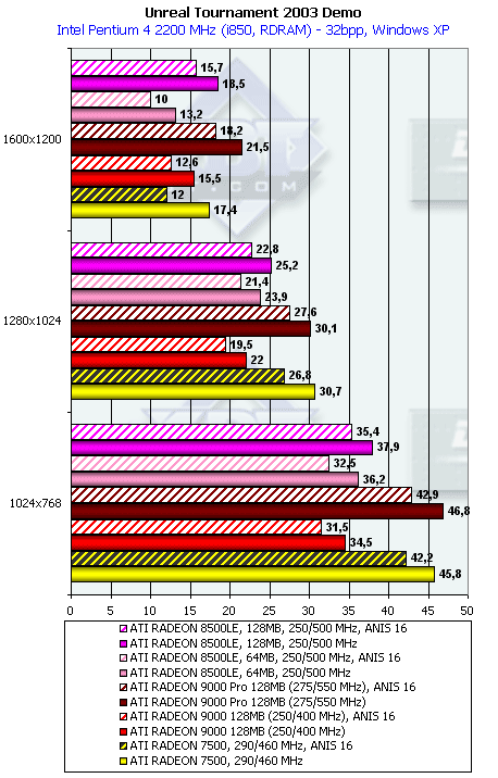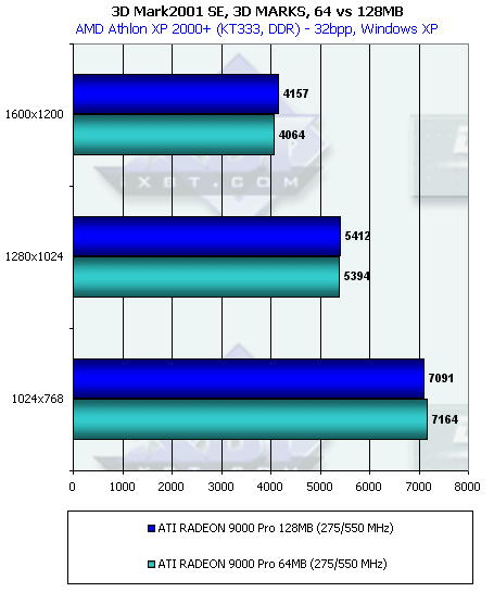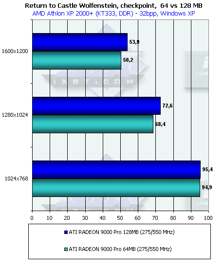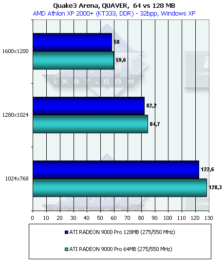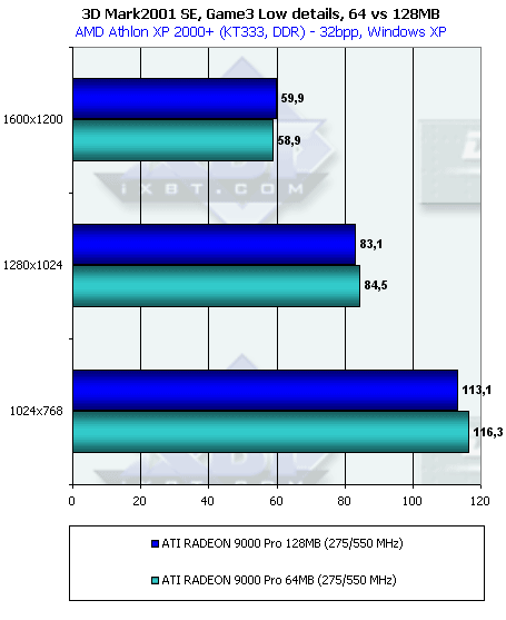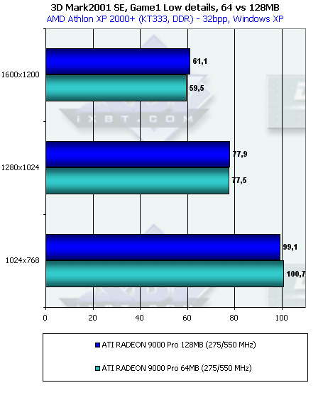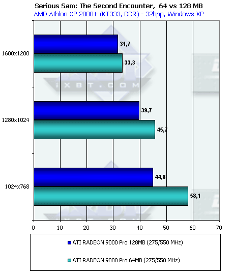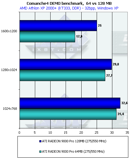 А в этом тесте оба RADEON 9000 обогнали каждый "своего соперника". А разницы между 64- и 128-мегабайтными картами по-прежнему нет (имеется в виду скорость, конечно, а не цена :-).