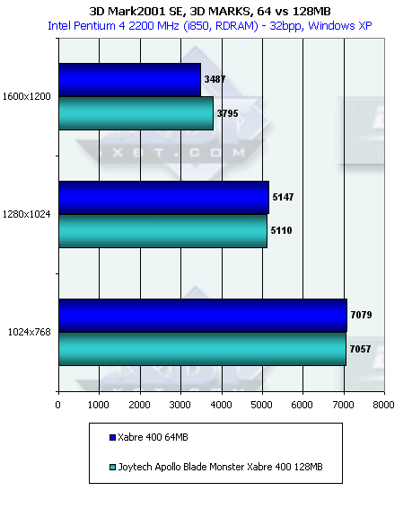 Мы являемся свидетелями блестящей победы Xabre 400 над своими соперниками, даже только-только вышедшим RADEON 9000/Pro. Сравнение карт с разными объемами памяти показало, что только в 1600х1200 выявилась нехватка 64-х мегабайт, где 128-мегабайтная карта оказалась очень даже в приличном выигрыше.