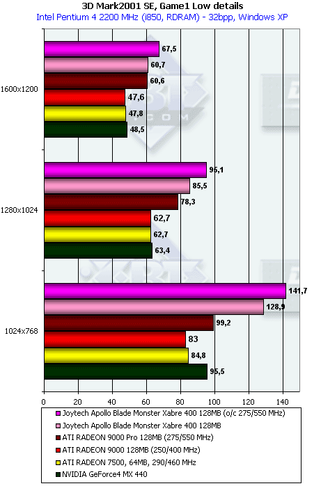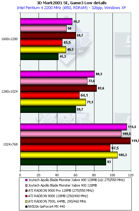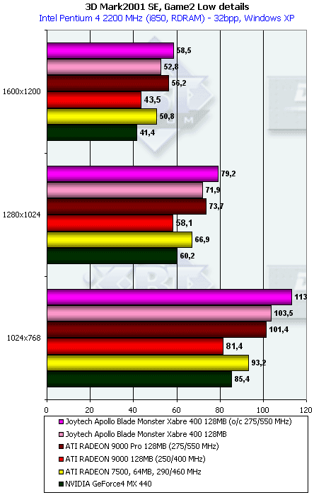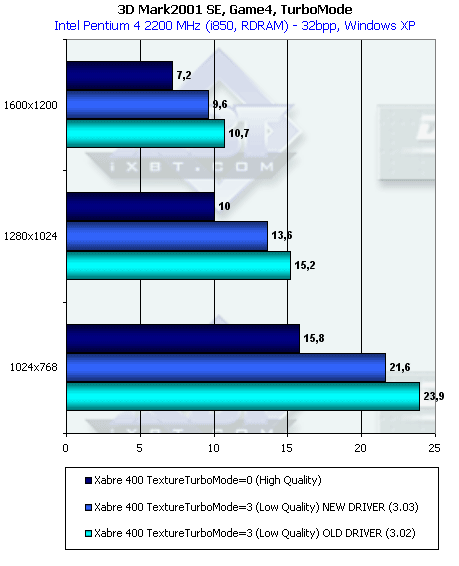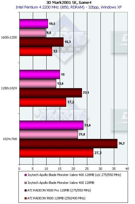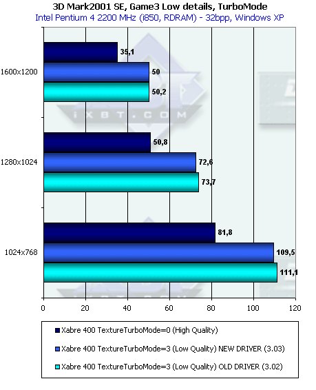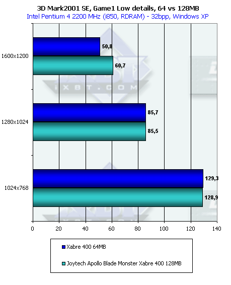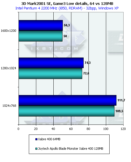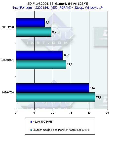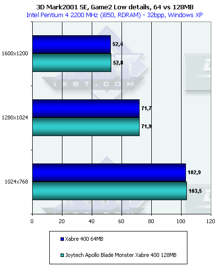 Более эффективная работа с памятью у RADEON 9000 дала о себе знать в данном тесте с большим числом overdraw. Но, тем не менее, Xabre 400 практически не проиграл в целом. И 64-х, и 128-мегабайтная карты показали одинаковую производительность.