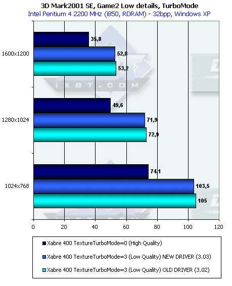 Но не все пока так хорошо, поскольку, например, игра Morrowind по-прежнему не "видит" шейдеров у SIS Xabre. А также есть ряд старых нареканий на качество в некоторых играх. Ну и отсутствие трилинейной фильтрации при TurboMode=3 является очень большим минусом.
