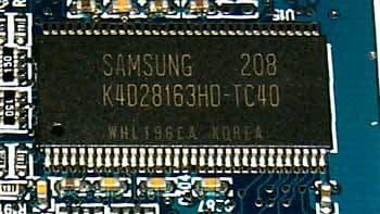 Что сразу можно сразу интересного отметить… Ну прежде всего то, что опытному тестеру даже не надо смотреть на маркировку микросхем памяти, достаточно глянуть на дизайн и увидеть, что в 8-ми микросхемах DDR SDRAM "старой" упаковки уместить 128 мегабайт памяти может только Samsung (практически все карты с таким объемом памяти и "старым" дизайном, не предполагающим комплектацию микросхемами в BGA-упаковке, имеют память от Samsung).