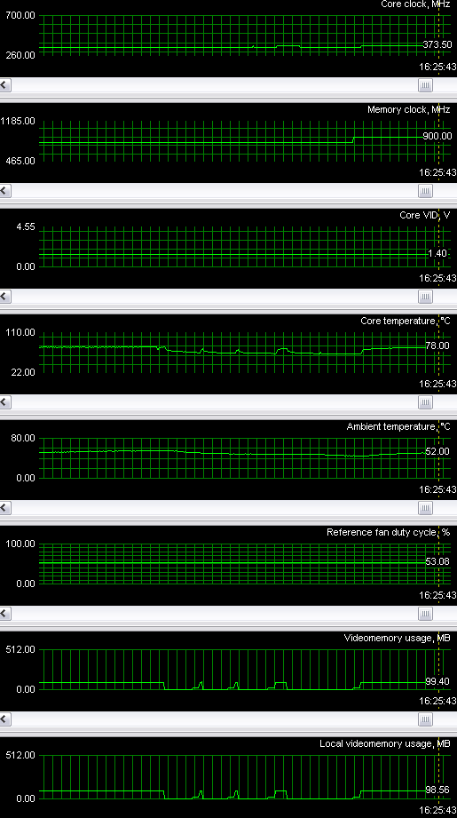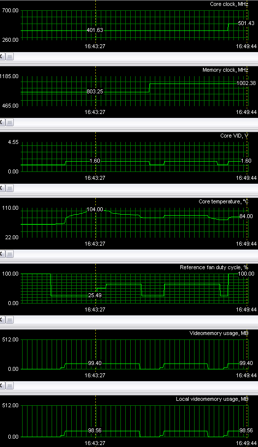 Следует заметить, что видеокарта на базе 6600 легко поддавалась управлению кулером с помощью RivaTuner. И видно, что при выставлении частоты вращения на уровне всего 25% от максимальных оборотов — температура ядра под нагрузкой резко возрастала свыше 100 градусов, что явно опасно. Компромисс был получен при установке 50% от максимальной частоты вращения, что еще не создавало неприятного шума кулера, но при этом температура снизилась до 85 градусов.