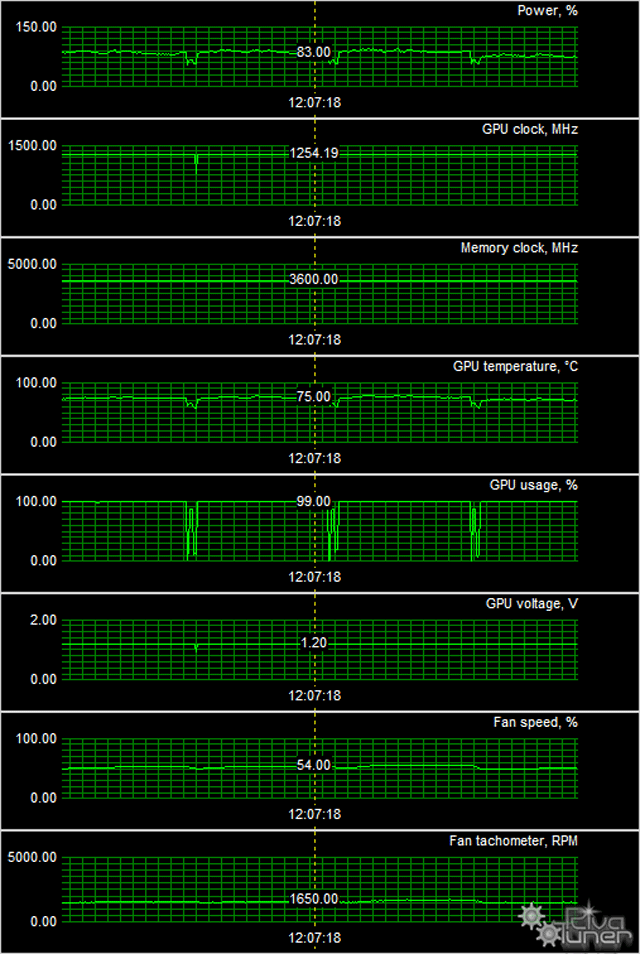 Мы провели исследование температурного режима с помощью утилиты EVGA PrecisionX (автор А. Николайчук AKA Unwinder) и получили следующие результаты:
