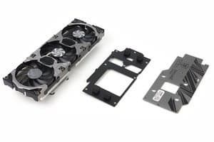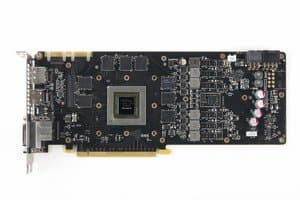 Мы видим по сути полную копию эталонного дизайна. Схема питания 6-фазная, управляемая цифровым контроллером. Все остальное схоже с ранее изученными нами разводками печатных плат для GTX 770. Следует отметить, что несмотря на то, что размеры печатной платы не выходят за рамки принятых стандартов для топовых продуктов (270×100 мм), очень громоздкая СО значительно увеличивает размеры ускорителя, который занимает 3 слота в системном блоке.
