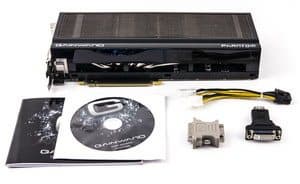 Базовый комплект плюс адаптеры HDMI-to-DVI, DVI-to-VGA, а также разветвитель питания на 8 контактов. Таким образом, к видеокарте «прямо из коробки» можно одновременно подключить три монитора через DVI!