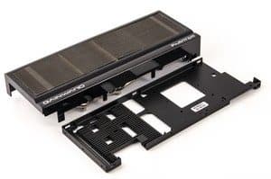 Мы видим большой радиатор во всю длину карты, и от подошвы, прижимающейся к ядру, к радиатору идут тепловые трубки. На радиаторе закреплены три вентилятора, которые засасывают воздух снаружи и прогоняют его через радиатор. Всё это покрыто кожухом, поэтому снаружи создается ощущение, что СО не имеет вентиляторов, так как их не видно.