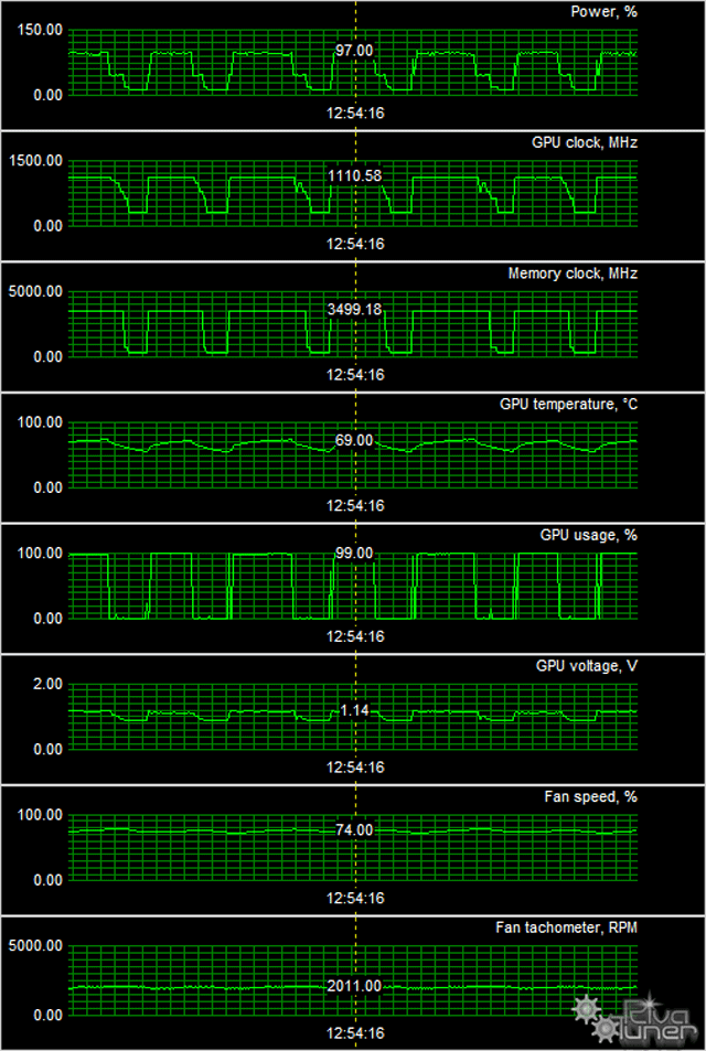 Мы провели исследование температурного режима с помощью утилиты EVGA PrecisionX (автор А. Николайчук AKA Unwinder) и получили следующие результаты: