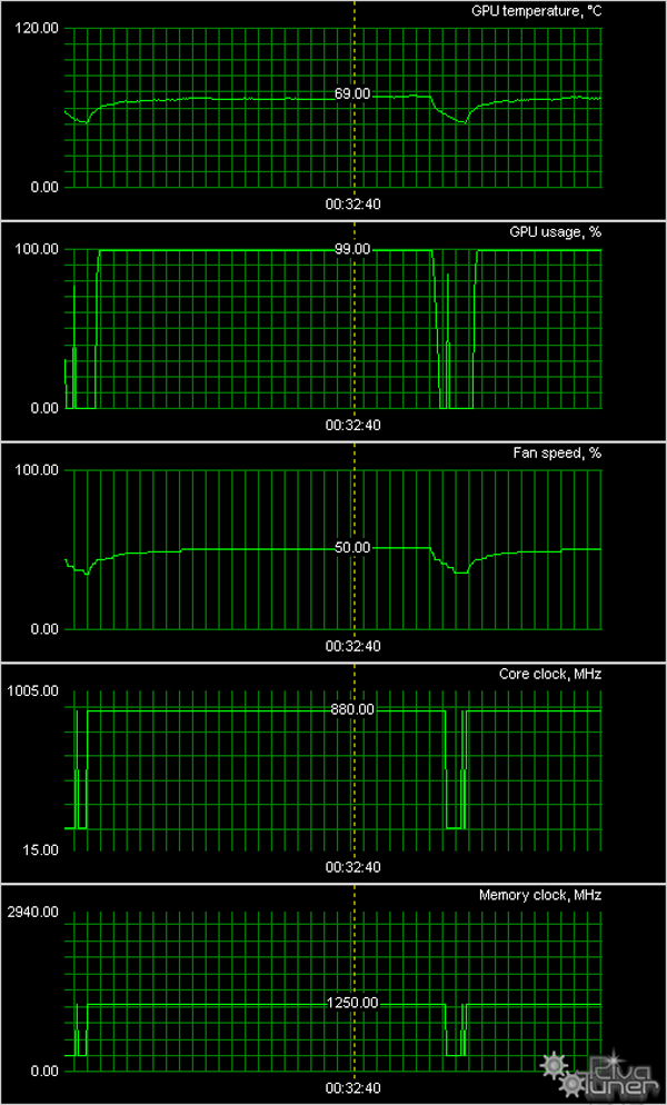 Мы провели исследование температурного режима с помощью утилиты MSI Afterburner (автор А. Николайчук AKA Unwinder) и получили следующие результаты: