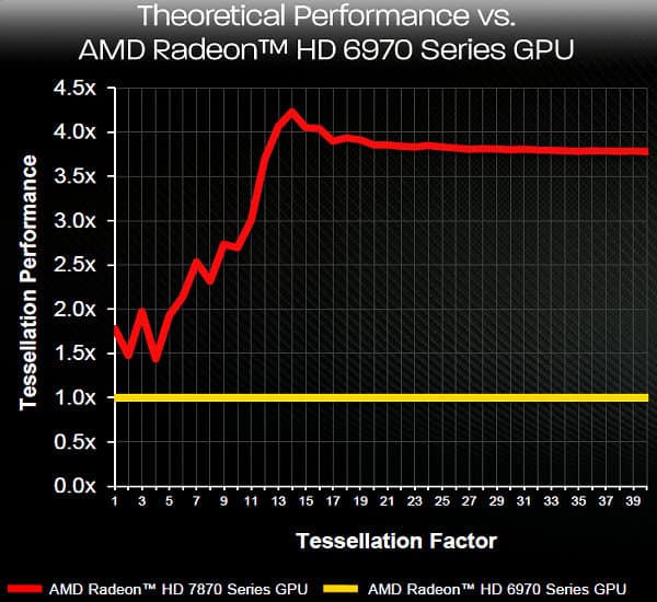 Как и все остальные чипы архитектуры GCN, Pitcairn имеет в своём составе блок тесселятора 9-го поколения, отличающийся многочисленными оптимизациями по буферизации и кэшированию, позволяющий заметно повысить производительность обработки геометрии. Вот сравнение новой платы компании AMD с решением предыдущего поколения в синтетической задаче, по которому можно предположить рост скорости тесселяции вплоть до четырёхкратного: