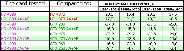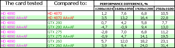 Теперь по существу. Очевидно, что RADEON HD 4890 существенно усилил линейку продуктов 4ххх от AMD, позволив уже вплотную приблизиться к однопроцессорному флагману от Nvidia — Geforce GTX 285 (с которым вообще-то призван соперничать 4870 X2). Также очевидно, что бывший вполне успешный соперник HD 4870 — Geforce GTX 260 уже в данном случае безнадежно отстал от новинки.
