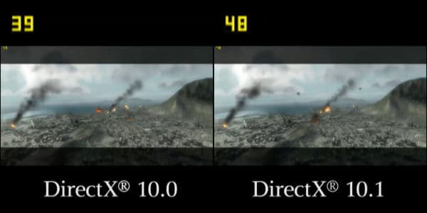 Но Clear Sky — это не такая уж новая игра, а ведь в последнее время вышли несколько совсем свежих игровых приложений с поддержкой DirectX 10.1, выпущенных при содействии компании AMD. Одной из таких игр является довольно популярная Tom Clancy's H.A.W.X. от Ubisoft. По 3D графике она отличается тем, что в ней применены качественные алгоритмы Screen Space Ambient Occlusion (SSAO) и гауссово размытие карт теней. Оба этих алгоритма хоть и не требуют обязательного использования возможностей DX10.1, но получают значительное ускорение от некоторых возможностей API этой версии. Так, по встроенному бенчмарку в разрешении 1920х1080, ускорение от перехода на DX 10.1 достигает 20%. На изображении ниже показаны кадры из бенчмарка с цифрами мгновенного FPS: