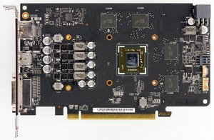 Карта имеет 4 ГБ памяти GDDR5 SDRAM, размещенной в 4 микросхемах по 8 Гбит на лицевой стороне PCB. Микросхемы памяти Micron (GDDR5). Микросхемы рассчитаны на номинальную частоту работы в 1750 (7000) МГц. | ![]() |