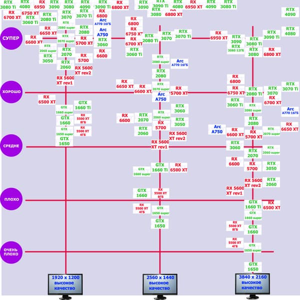 | 13 | Arc A770 16 ГБ, 2100—2400/17500 | 69 | 243 | 35 000 |