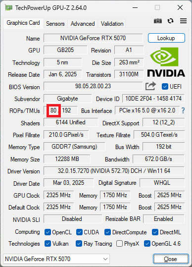 Графический процессор работает на базовой частоте 2325 МГц, которая может повышаться до турбо-частоты в 2512 МГц. Что касается подсистемы памяти, то она состоит из шести 32-битных контроллеров GDDR7-памяти, дающих общую 192-битную шину памяти. Чипы памяти объемом 12 ГБ работают при эффективной скорости передачи данных в 28 Гбит/с, обеспечивая общую пропускную способность в 672 ГБ/с — сразу на треть больше, чем у GeForce RTX 4070 с GDDR6X-памятью скоростью в 21 Гбит/с. Также в GeForce RTX 5070 активны все 48 МБ L2-кэша, что еще больше улучшает возможности по работе с памятью, ведь кэша также больше, чем 36 МБ в GeForce RTX 4070.