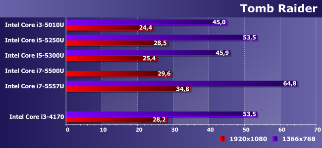 В первой игре всех «еще мало», во второй — кое-как можно «натянуть» режим низкого разрешения, но в общем и целом картина была ясна еще ранее. Графическая часть в Broadwell стала на 20% мощнее, чем в Haswell при сравнении GT2 с GT2, а BW-GT3 против HW-GT2 в теории может обеспечить еще большую разницу. Но лишь в теории, поскольку двухъядерные Broadwell в вариантах с TDP выше 30 Вт не существуют (за исключением такой специфической модели, как i5-5350H, но там вообще GT3e со всеми вытекающими), что не позволяет им работать на высоких частотах. «Одноклассников» они при этом опережают, разумеется, но вот с «настольными» Haswell бывает всякое. Впрочем, TDP 28 Вт (а такой бывает только при наличии GPU GT3), как видим, нередко позволяет добиться как минимум паритета с не самыми медленными Core i3 настольного семейства. Но это максимум, на который можно рассчитывать.