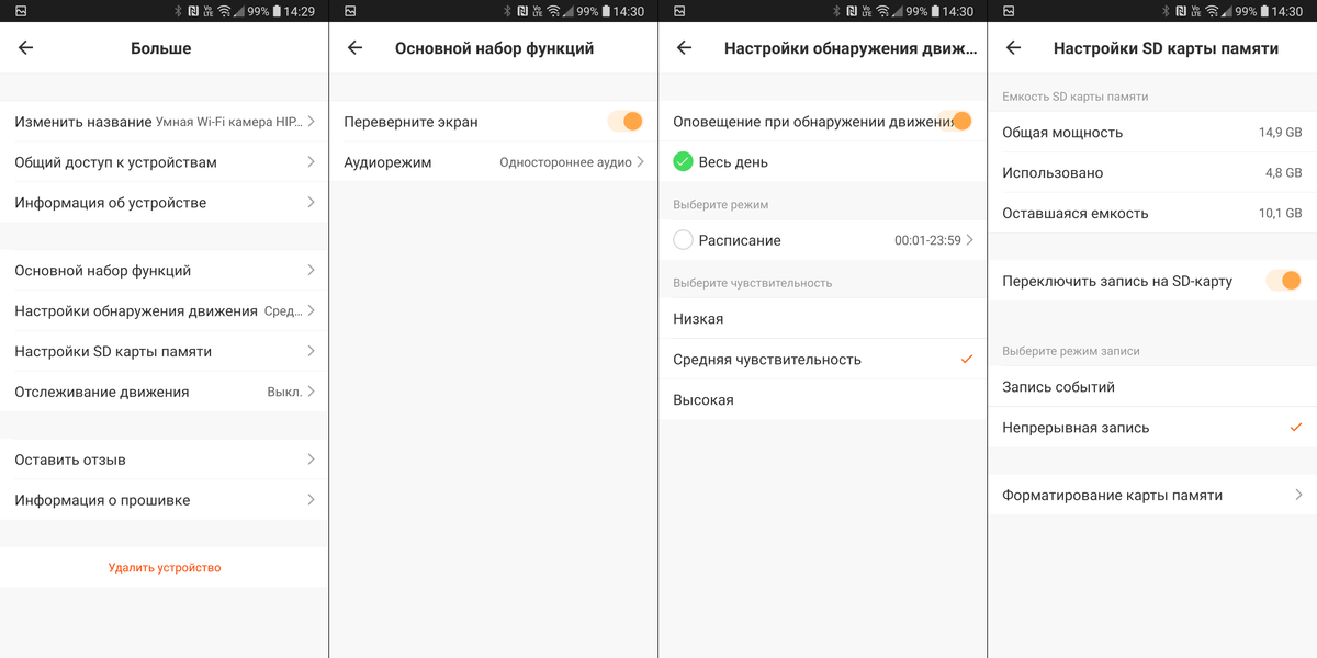 Для начала перейдем на страницу настроек (стандартная кнопка с тремя точками в верхнем правом углу). Здесь мы можем перевернуть видео, если камера закреплена к потолку, а также изменить аудиорежим. Еще одна вкладка позволяет настроить чувствительность датчика движения, а также включить оповещение при обнаружении движения.